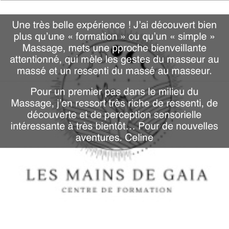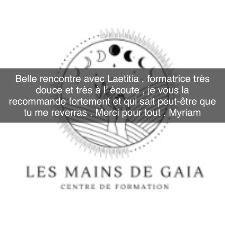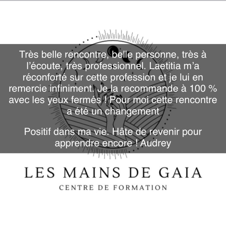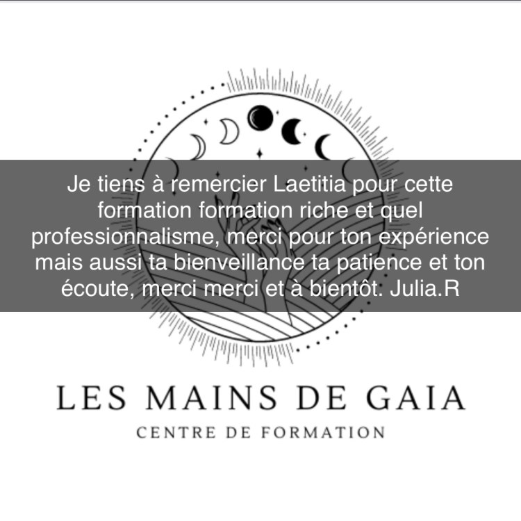 “Quand j’ai rejoint l’école, je doutais de tout : de moi, de ma légitimité, de ma capacité à y arriver. Laetitia a su poser un cadre rassurant, doux et puissant à la fois. J’ai découvert que j’avais déjà en moi tout ce qu’il fallait. Aujourd’hui, je masse avec confiance, j’ai ouvert mes premiers créneaux… et surtout, je me sens femme à part entière. Merci du fond du cœur.”